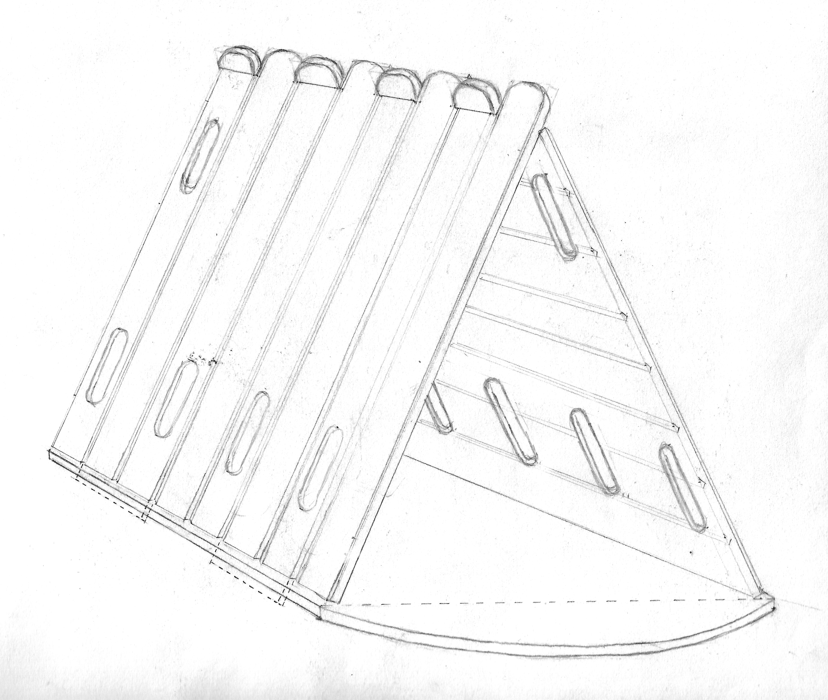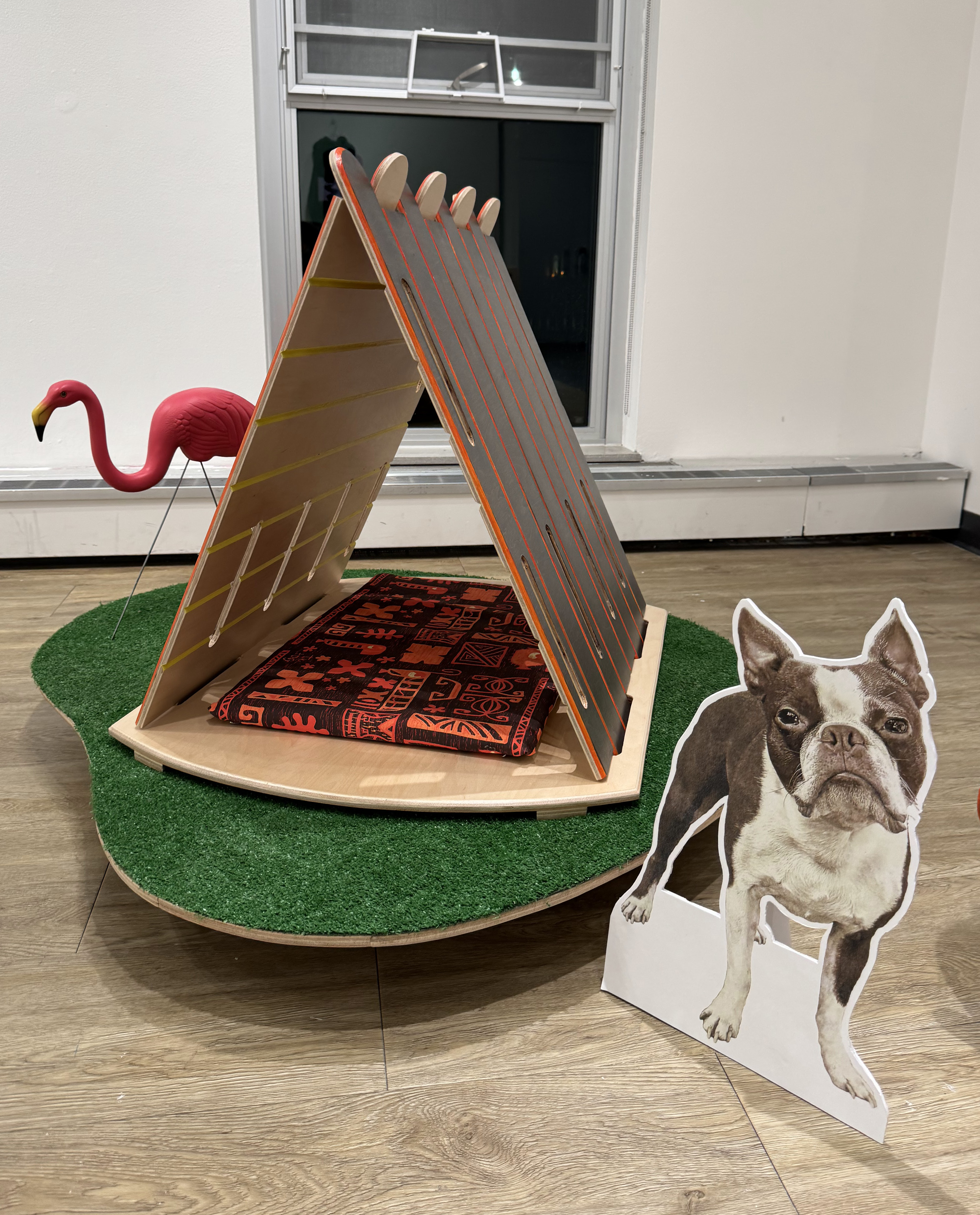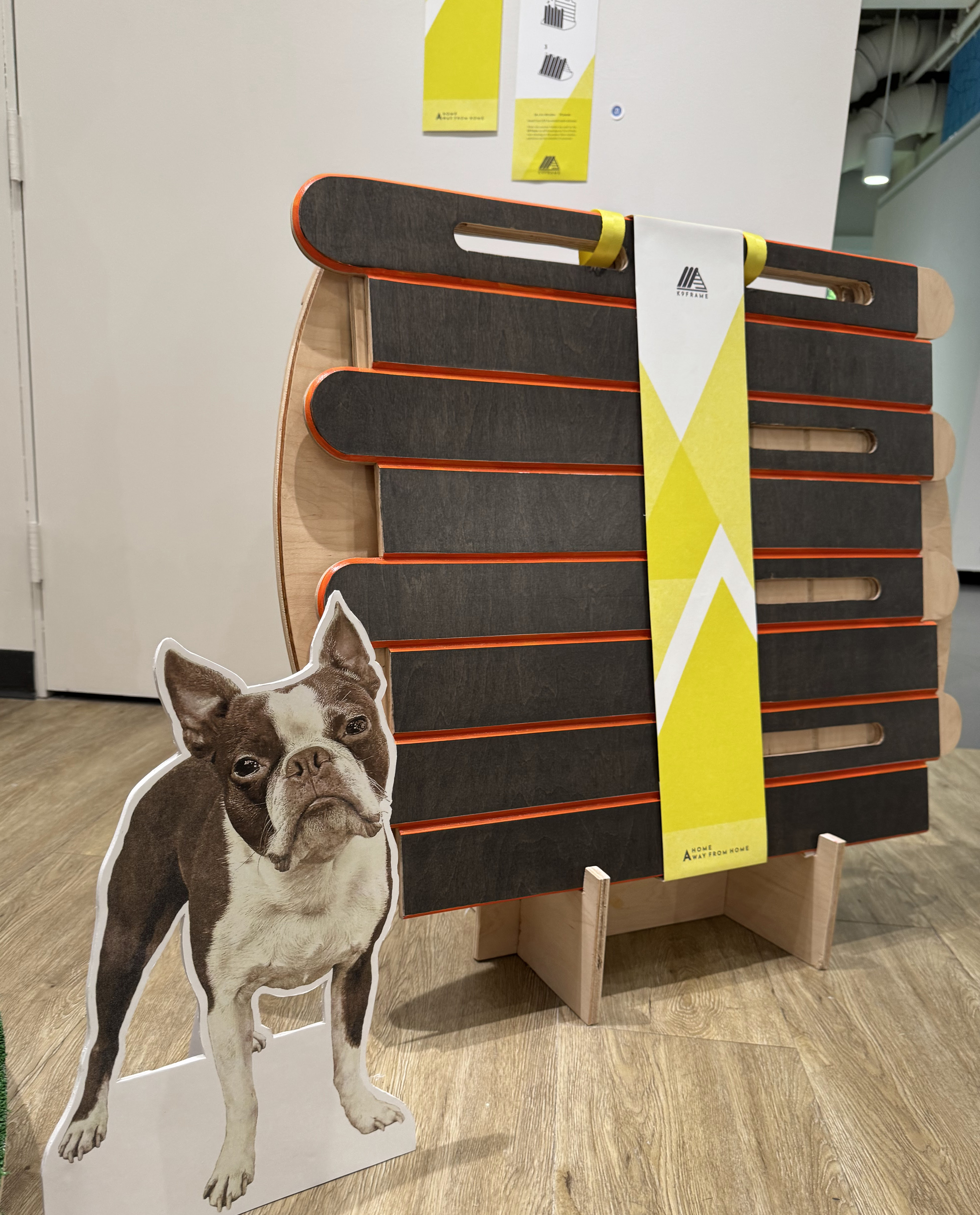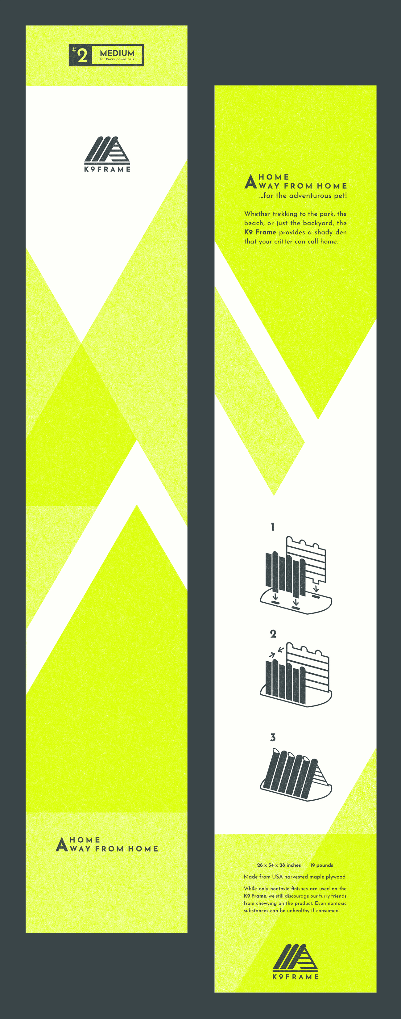 The K9 Frame doghouse was designed to quickly assemble/disassemble for easy transport. Its development includes the three-piece shelter and unique packaging, which required detailed planning, precise measuring, and careful crafting. It was inspired by the timeless simplicity of the a-frame structure and sought to retain as much of that simplicity as possible.
